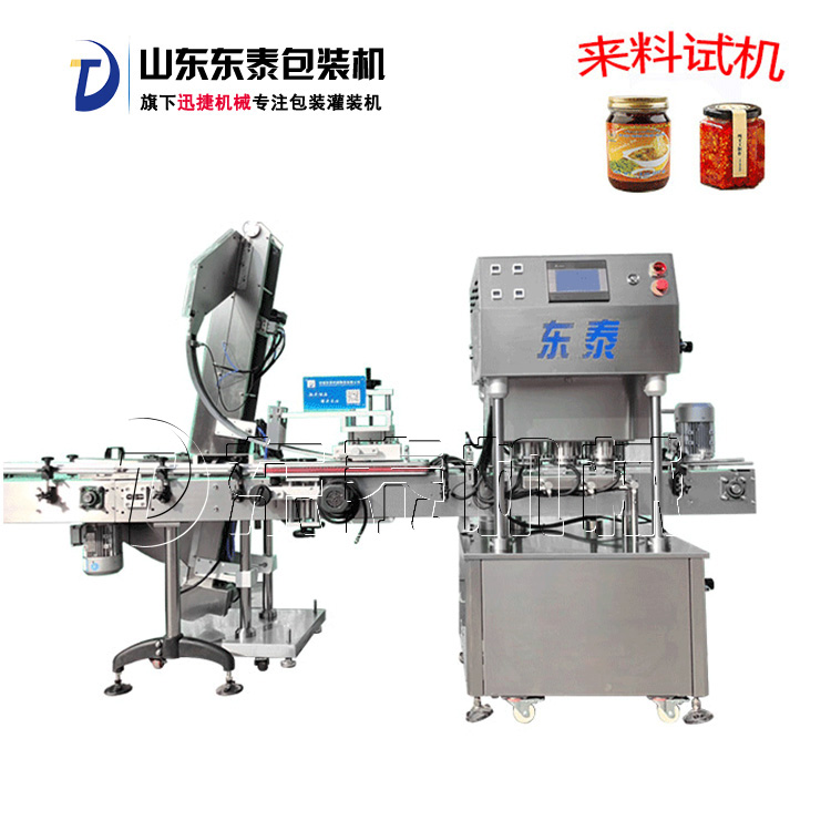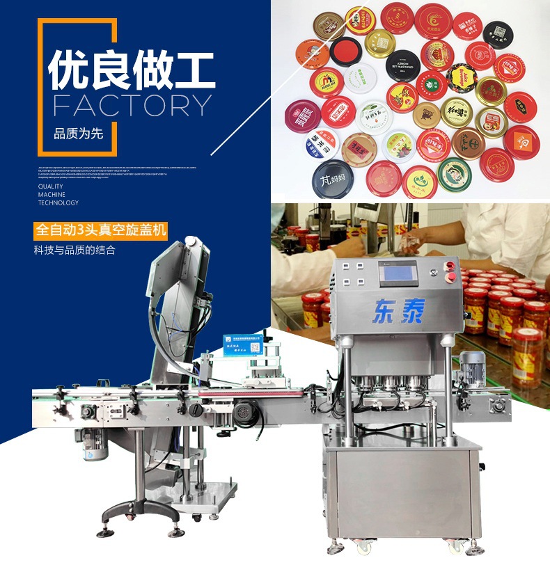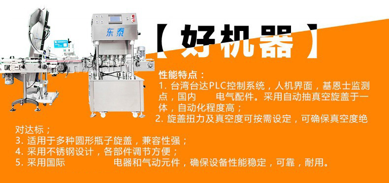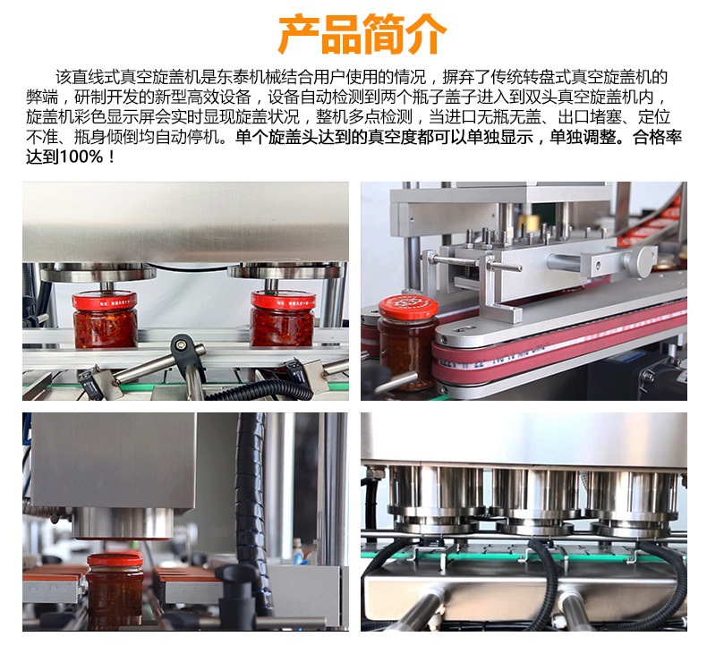 該直線式真空旋蓋機是東泰機械結合用戶使用情況,摒棄了傳統(tǒng)轉盤式真空旋蓋機的弊端,研制開發(fā)的新型高效設備,設備自動檢測到兩個瓶子蓋子進入到雙頭真空旋蓋機內,旋蓋機彩色顯示屏會實時顯示旋蓋狀況,整機多點檢測,當進口無瓶無蓋、出口堵塞、定位不準、瓶身傾倒均自動停機。單個旋蓋頭達到的真空度都可以單獨顯示,單獨調整。合格