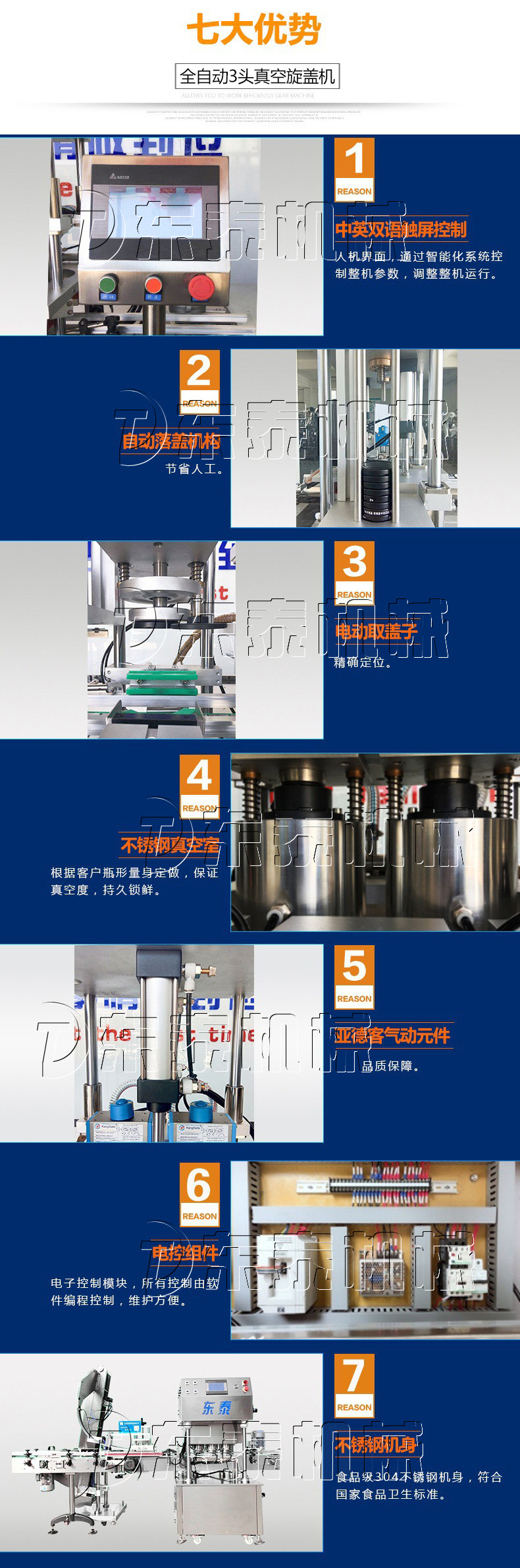 1.臺灣臺達PLC控制系統(tǒng),人機界面,基恩士檢測點,國內電氣配件。采用自動抽真空旋蓋于一體,自動化程度高;