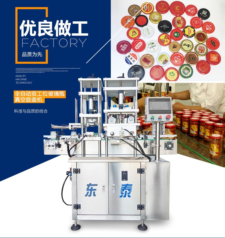 該機借鑒國外技術(shù),結(jié)合國內(nèi)客戶需求研發(fā)而成。該機集自動進瓶、自動理蓋上蓋、自動抽真空旋蓋、自動出瓶于一體,生產(chǎn)效率高,運行穩(wěn)定可靠,是食品醬料、飲料、保健品等行業(yè)馬口鐵三(四)旋蓋理想的抽真空旋蓋設(shè)備。