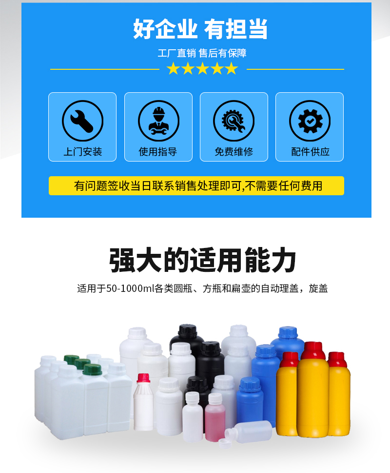 1、通用性強(qiáng):適用于50-1000ml各類圓瓶、方瓶和扁壺的自動理蓋,旋蓋;