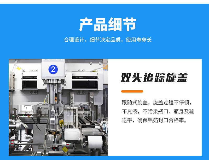 2、品質(zhì)高:跟隨式旋蓋,旋蓋過程不停頓,不晃液,不污染瓶口、瓶身及輸送帶,確
