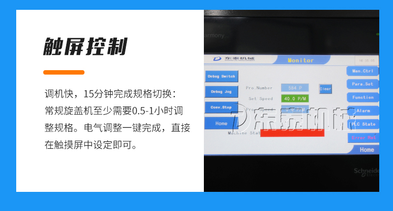 7、調(diào)機(jī)快,15分鐘完成規(guī)格切換:常規(guī)旋蓋機(jī)至少需要0.5-1小時調(diào)整規(guī)格。