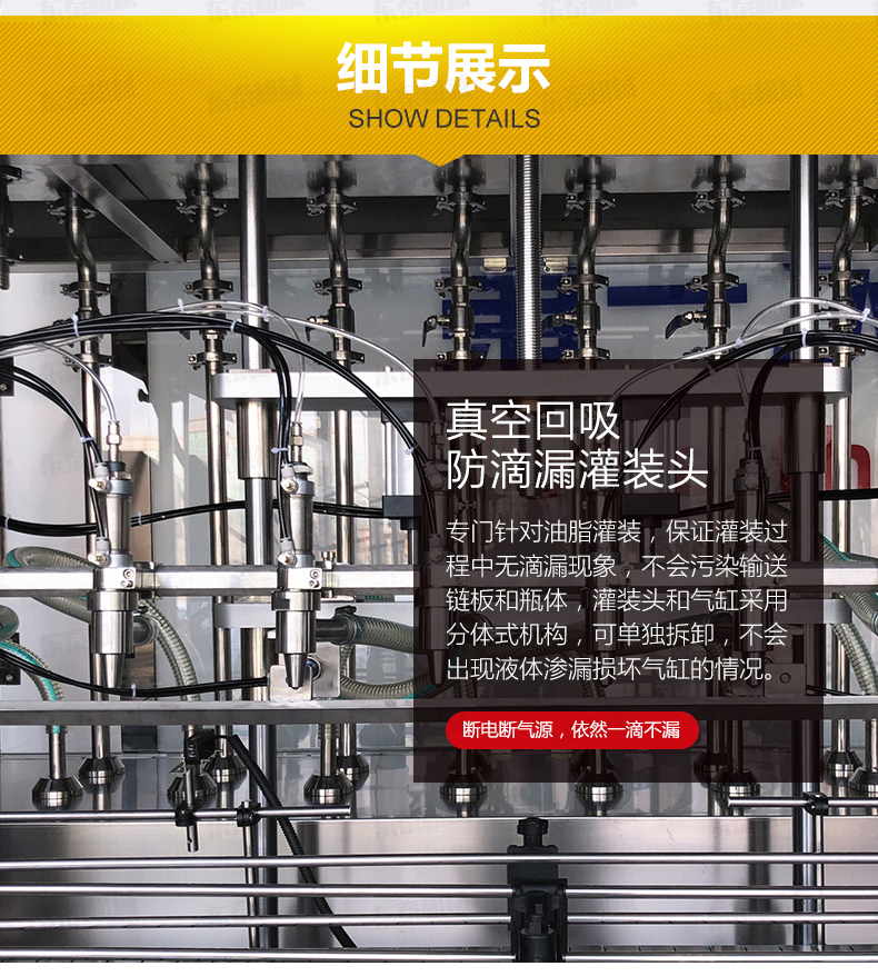 1、灌裝頭采用知識(shí)產(chǎn)權(quán)局認(rèn)證的實(shí)用新型專利:真空回吸防滴漏灌裝頭