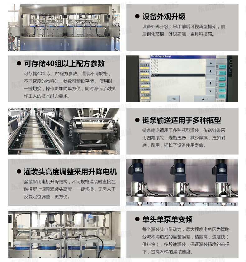 該系列灌裝機(jī)采用容積式計(jì)量灌裝原理,多項(xiàng)專利認(rèn)證,適用于各種規(guī)格(1-5L)的液體肥等液體灌裝。設(shè)備采用伺服驅(qū)動(dòng)活塞計(jì)量,保證了 1‰的灌裝精度,在保證灌裝精度的同時(shí),提高了 20%-35%的灌裝速度,操作簡單,維護(hù)方便,節(jié)省人工成本,生產(chǎn)效率更高。