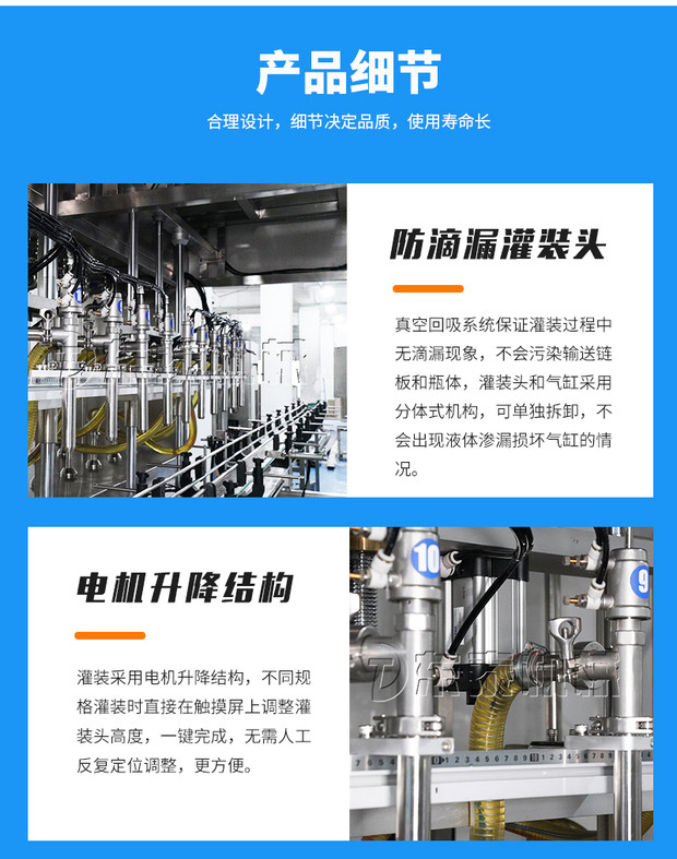 過程中無滴漏現(xiàn)象,不會污染輸送鏈板和瓶體,灌裝頭和氣缸采用分體式機(jī)構(gòu),可單獨(dú)拆卸,