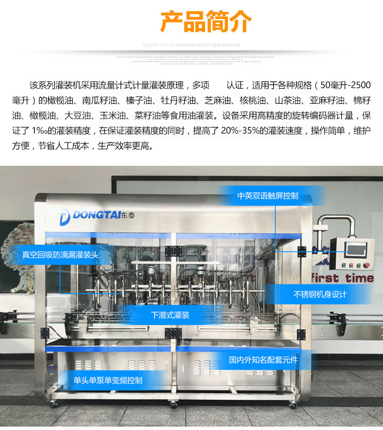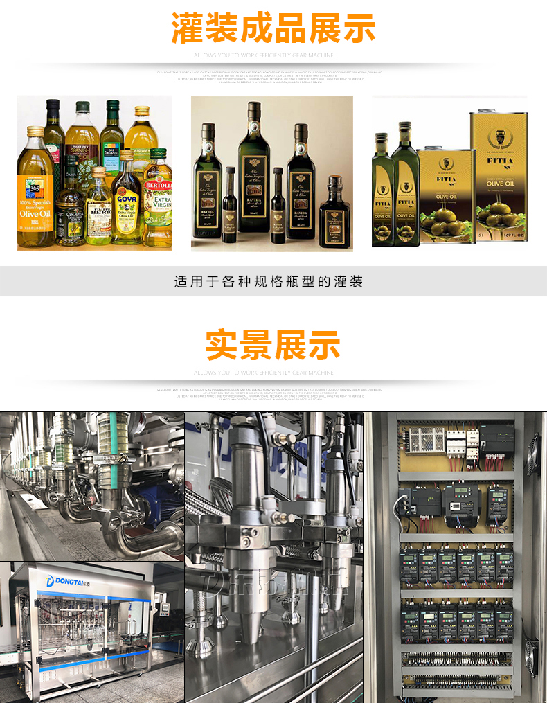該食用油灌裝機(jī)采用流量計(jì)式計(jì)量灌裝原理,多項(xiàng)認(rèn)證,適用于各種規(guī)格(1-5升)的南瓜籽油、榛子油、牡丹籽油、芝麻油、核桃油、山茶油、亞麻籽油、棉籽油、橄欖油、大豆油、玉米油、菜籽油等食用油灌裝。設(shè)備采用高精的旋轉(zhuǎn)編碼器計(jì)量,保證了1%o的灌裝精度,在保證灌裝精度的同時(shí),提高了20%-35%的灌裝速度,操作簡單,維護(hù)方便,節(jié)省人工成本,生產(chǎn)效率更高。